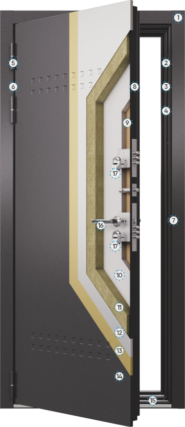 8. полотно составное толщиной 104 мм, наружная часть из цельногнутого листа металла 1,4 мм с ППП, внутренняя часть из полимерного материала
