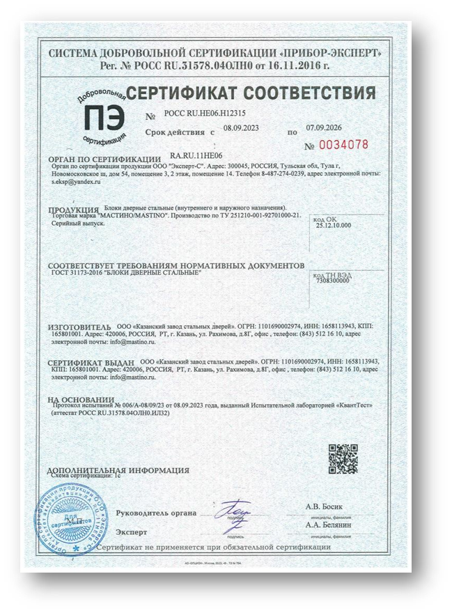 Каждая дверь имеет свой паспорт производства в соответствии с ТУ 25.12.10-002-65490512-2023.